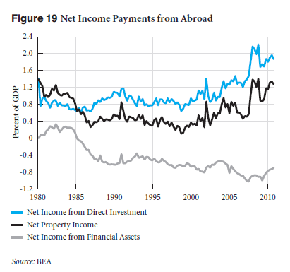 There are two more tables I see closely. The first is the net income payments from the rest of the world, which surprisingly remains positive, leading to a lot of literature about “dark matter”. (More on that some other time). This, according to the Z.1 is the “net receipts from foreigners of interest, corporate profits, and employee compensation”.